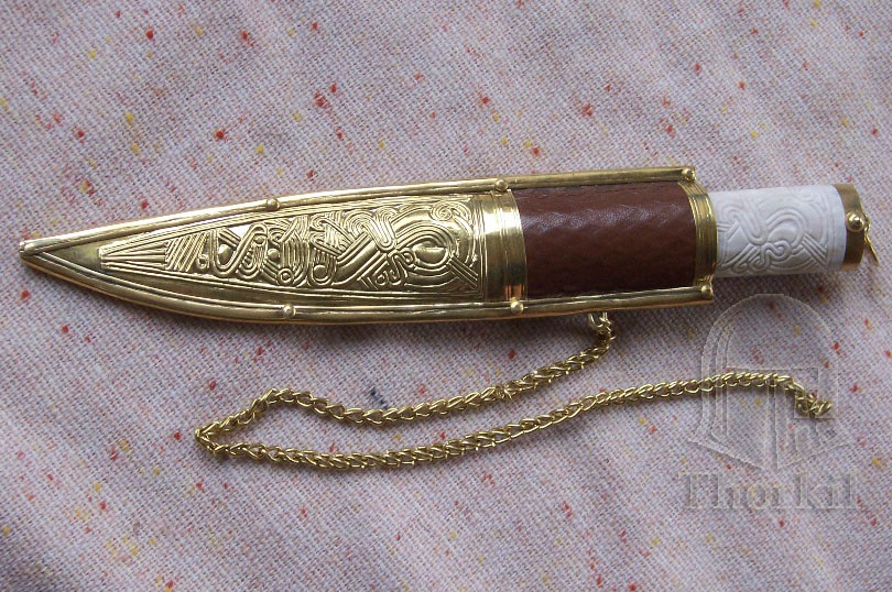 Pattern-welded, hand forged blade. Brass press-bleche on scabbard. The whole knife made solely by me.